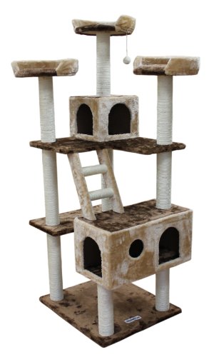 Kitty mansions 'beverly hills' cat tree is a huge estate that stands just over 6 feet. It features nine platforms, an extra large master bedroom, stairs that lead to another bedroom, three watch towers, and scratchings posts located everywhere. Both bedrooms have two entrances and the master bedroom even has a window. This is a large living area perfect for two or more cats who enjoy the finer things in life.